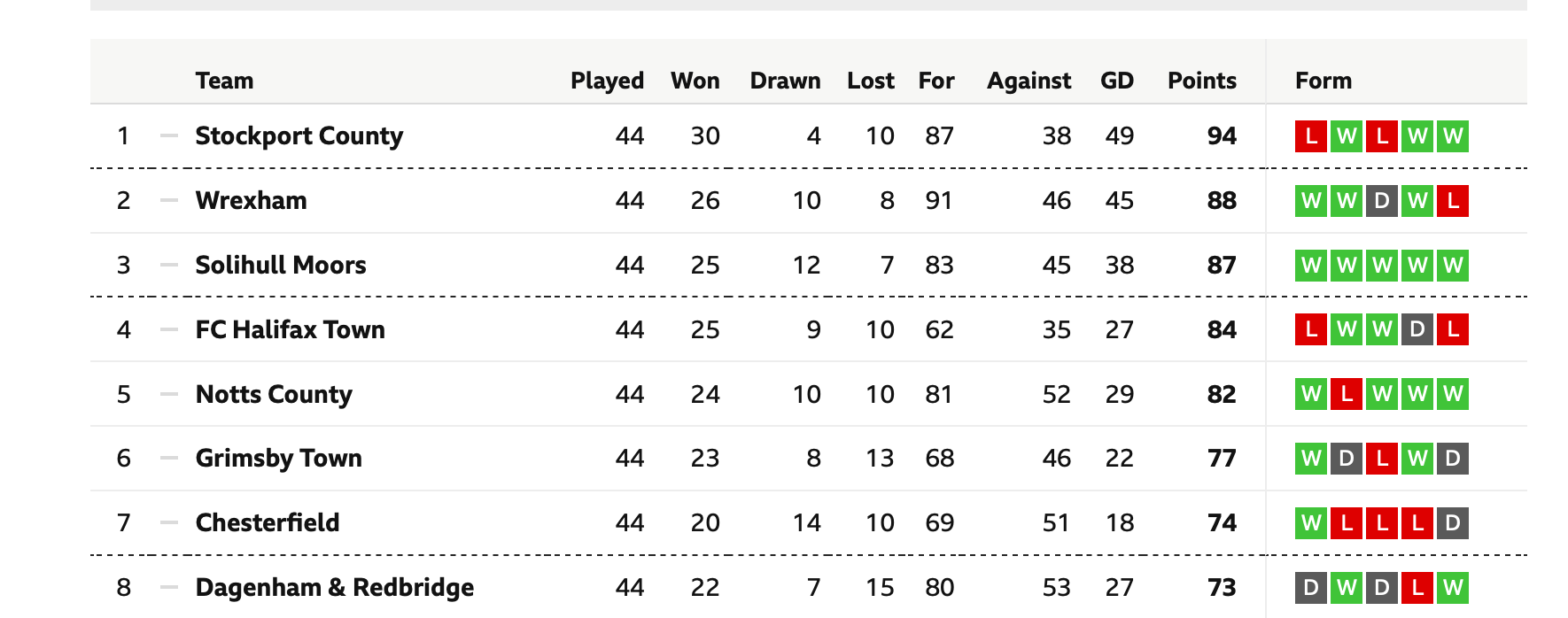 Let's set out the facts. Look at that league table. 11 points, and a goal difference 23 better than Grimsby. One win apiece in the regular season. Ah, but Wrexham have never won a playoff game. That might not be true, I haven't actually checked. But it's good enough as a 'Football Fact'. Football Fact Number 2 is that since buying a share of the club, Mr McElhenney has not attended a game that Wrexham have won. It's probably not a big sample size, but again it's a Football Fact. Mr McElhenney should probably stay away. For Wrexham's sake.